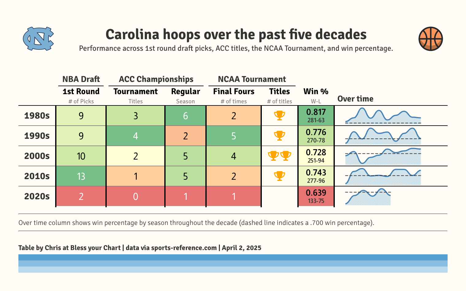 Here’s a look at Carolina’s performance, grouped by decade since 1980.